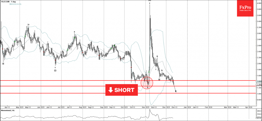 Filecoin: ⬇️ Sell– Filecoin broke key support level 1.435– Likely to fall to support level 1.000Filecoin cryptocurrency recently broke below the key support level 1.435, which reversed the price twice from the start of Decem...