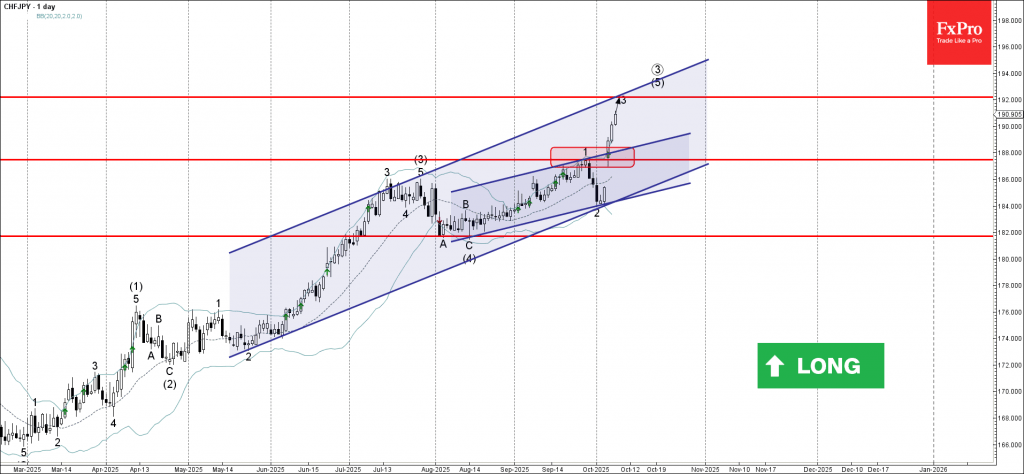 CHFJPY: ⬆️ Buy– CHFJPY broke key resistance level 187.50– Likely to rise to resistance level 192.00CHFJPY currency pair recently broke the key resistance level 187.50 (which stopped the previous impulse wave 1 at the end of September)...