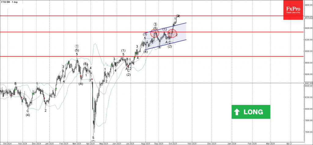 FTSE 100: ⬆️ Buy– FTSE 100 broke round resistance level 9330.00– Likely to rise to resistance level 9612.00FTSE 100 index recently broke the resistance level 9330.00, which stopped the previous impulse waves (5) and (1).The breakout o...