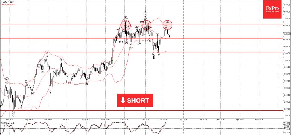 Tesla: ⬇️ Sell– Tesla reversed from pivotal resistance level 464.00– Likely to fall to support level 420.00.Tesla recently reversed up from the resistance zone between the pivotal resistance level 464.00 (which has been reversing the ...