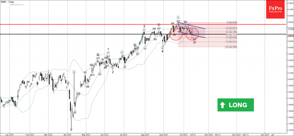 Barclays: ⬆️ Buy– Barclays reversed from support area– Likely to rise to resistance level 3.865Barclays recently reversed up from the support area between the pivotal support level 3.7000 (which has been reversing the price ...