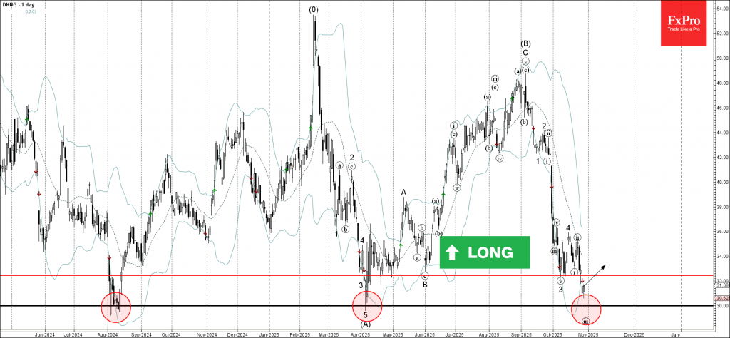 DraftKings: ⬆️ Buy– DraftKings reversed from support area– Likely to rise to resistance level 32.45DraftKings recently reversed up from the support area between the long-term round support level 30.00 (which has been reversi...