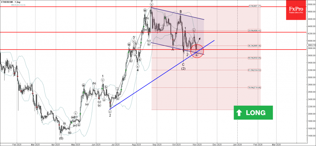 Ethereum: ⬆️ Buy– Ethereum reversed from support level 3800.00– Likely to rise to resistance level 4200.00Ethereum cryptocurrency recently reversed from the key support level 3800.00 (which has been reversing the price from the start ...