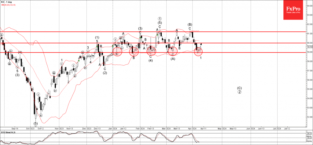 Coca-Cola today reversed from the pivotal support level 59.00, which has been steadily reversing the price from last April.